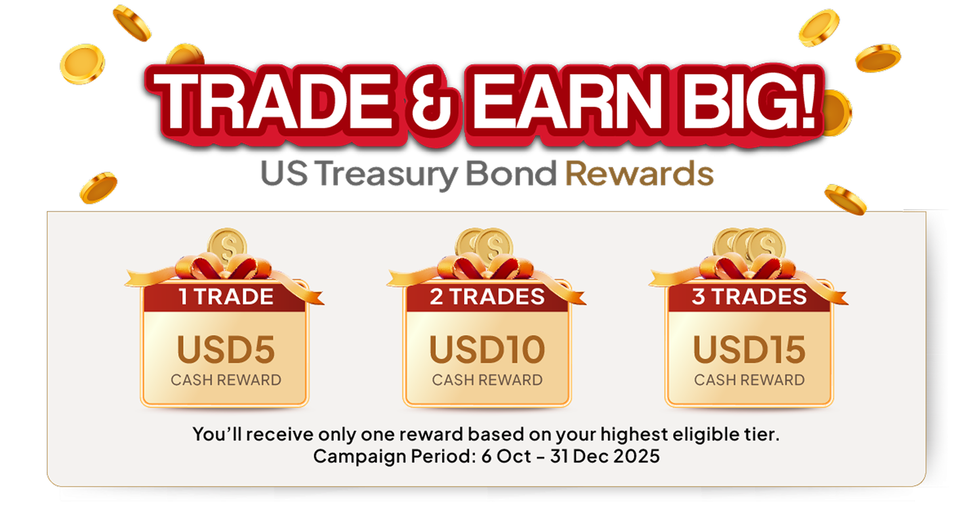 The campaign runs from 6 Oct 2025 to 31 Dec 2025. To qualify, your US Treasury trades must be completed within this period. Each eligible trade earns USD5, up to a total of USD15.